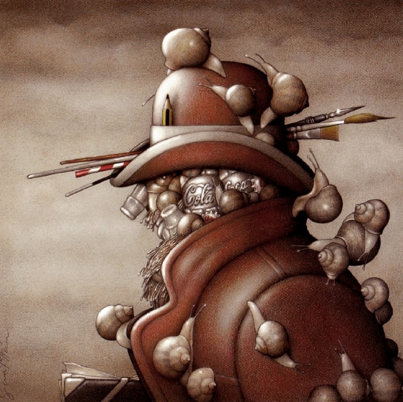 Comencé a dibujar ya de grande para lo que es esta actividad donde los primeros pasos del aprendizaje se dan normalmente en la infancia; yo lo hice pasada la adolescencia y siempre de manera autodidacta. Fue al principio de la década del setenta. Por ese entonces creí tener alguna revelación divina o cosa semejante ya que mi experiencia primera fue con el automatismo psíquico algo que los surrealistas inventaron a principio del siglo XX y que yo ignoraba. Se dio en mi por un fenómeno que hasta ahora es un misterio, ya que sin un propósito previo una tarde me encontré haciendo puntitos sobre una hoja en blanco y dibujando un ojo, siguiendo no se que dictado en forma de imágenes que fueron derivando al cabo de algunas horas en lo que considero mi primera obra y el acontecimiento que me señaló un camino. Creí estar frente a un mensaje del más allá, algún designio esotérico, en fin; es que por entonces mis conocimientos sobre arte, salvo la música, eran casi nulos. Con el tiempo fui encausando mi imaginario, y mi técnica que era el puntillismo e informándome de todo lo que pude. Con la publicación de mis primeros trabajos en algunos medios incorporé otros elementos hasta llegar a las técnicas mixtas que uso actualmente. Pero aún así siempre abordé mi trabajo como un deber, una manera de justificar mi existencia y la comisión de hacer conocer la experiencia propia de la imaginación, materia elemental y principio hegemónico de mi dibujo. Creo que todavía mantengo esa sensación de misterio ante el suceso artístico, de asombro por la revelación de las formas, ante el propio acto de imaginar, el devenir de las imágenes generadas por la mente y la transcripción al papel. Un acontecimiento simbólico para mí mucho más importante que la destreza de la mano que dibuja o los artilugios técnicos; que dicho sea de paso lo he vivido siempre como un acto apartado, de completa soledad.